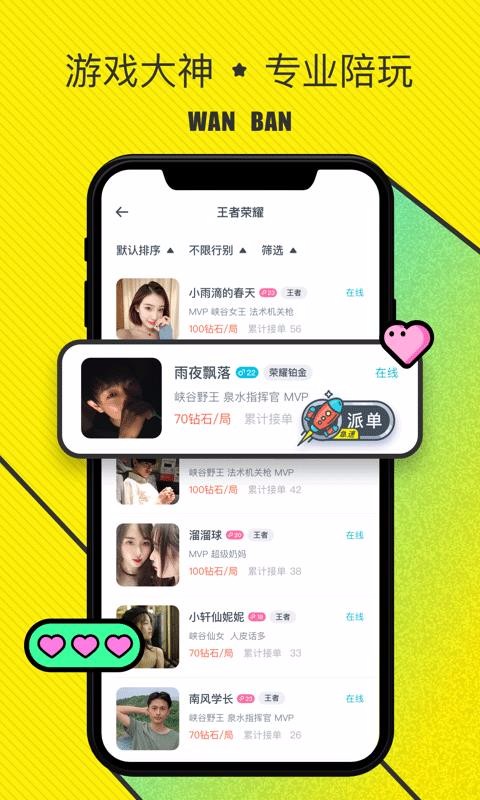 玩伴是一个语音交友软件,同时还可以发现各种陪玩,自行选择陪玩并下单进行玩游戏,同时用户还可以注册成为陪玩,发布订单进行赚钱;在线即可发现各类游戏陪练,涵盖王者荣耀、狼人杀、穿越火线、绝地求生等热门的游戏,还为你推荐了众多大神;用户选择游戏的类别后可以查看推荐的陪玩,自行根据性别、价格等进行筛选,并实时标注了在线或离线。
