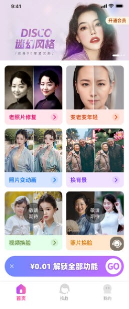 4、虚拟照片应用,多种滤镜可供选择,轻松改变发型,添加贴纸。