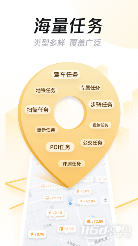 1、海量任务:任务多,覆盖广,类型全,更新快。任务覆盖全国300+城市,道路、地点、公交、地铁等任务尽有,满足驾车、骑车、步行等各种方式的用户