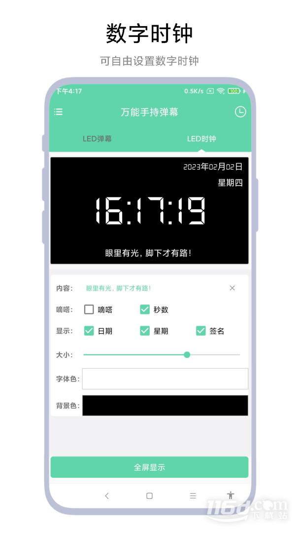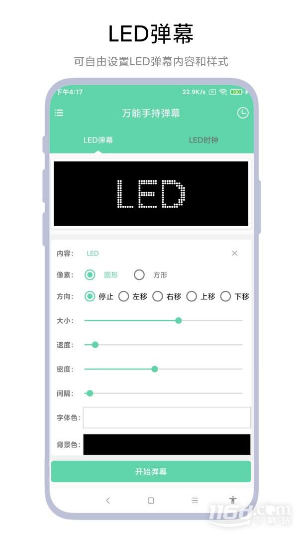 通过它可以生成各种LED显示弹幕。软件有着丰富的弹幕样式,可自定义文字,让手机变成LED显示屏或者数字时钟。可以修改模板的显示内容、大小、字体色和背景色,创建独在不同场景下使用的LED弹幕