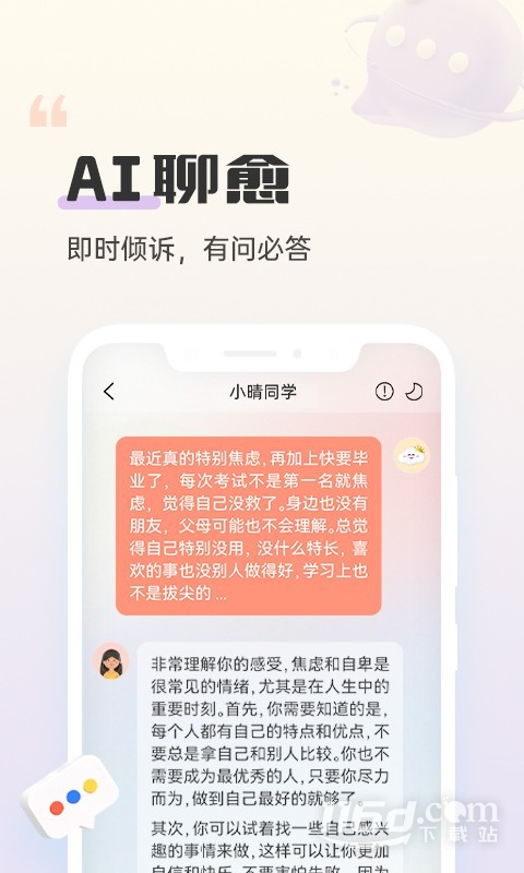 小晴同学是为大家提供情绪管理服务的软件!这款软件支持大家在手机手机上面轻轻松松获取很多心理管理服务!更让你轻松缓解心理压力,可以帮助年轻人释放压力,保持良好的心理状态,小晴同学多种趣味减压方式,ai聊愈,帮助用户释放压力。