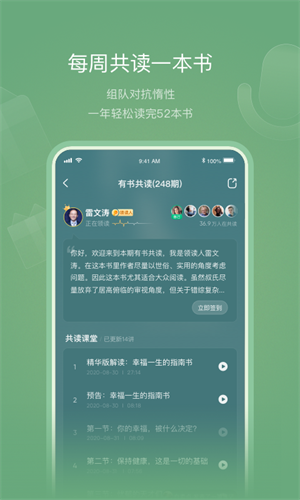 有书是一款能够帮助读者制定阅读计划的书籍阅读平台,读者可以在这里制定自己的读书计划,让自己能够在闲余时间来阅读这些书籍,能够丰富自己的见识。还能和其他的书友进行组队,形成互相监督、互相比较,共同避开懒惰的习惯,能够让读者在这里养成良好的阅读习惯。同时软件里还会给用户带来各种名师对书籍的精讲,让读者可以更好的理解这些书籍的深层含义,帮助读者更好的进行阅读。