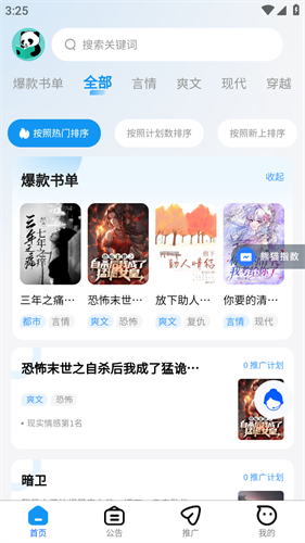 熊猫推书是一款手机免费追书软件,海量精选网文小说供你自由挑选,都市爽文、逆天反转等小说一应俱全,且均由创作者正版授权上架,内容完整无删减,且阅读全程纯净无广告,无需再担心小说因为无版权惨遭下架的问题,打造极致的手机追书体验。