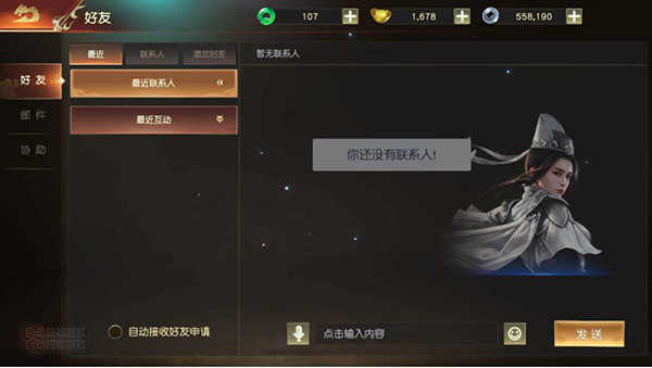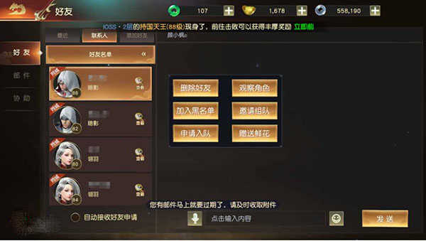 在好友界面可以看到【好友】、【邮件】以及【协助】三个大类功能,其中通过【好友】功能我们可以看到最近联系人/最近互动的角色,同时可以查看自己的好友列表以及进行添加好友等操作;【邮件】功能主要是领取系统奖励以及拍卖行道具等;【协助】功能则是可以看到帮派好友发的各种协助信息。