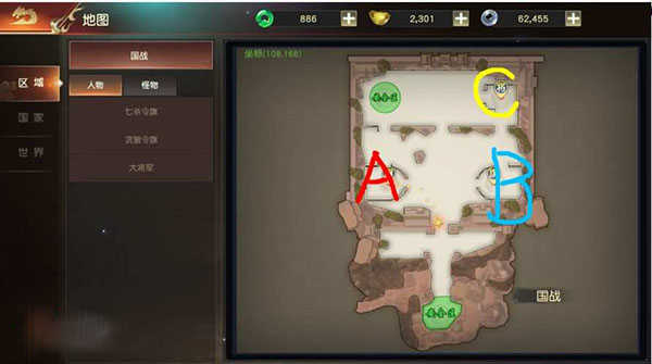 再如下图所示,地图上有A、B、C三个点,其中A点是七杀令旗,B点是贪狼令旗,C点是大将军。如果是攻方想要取得胜利,需要抢占七杀令旗以及贪狼令旗,同时还要击杀大将军;而守方只要能守住七杀、贪狼令旗以及大将军就是最后胜利的一方了。