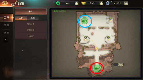 跨国国战通俗一点来说,就是据点争夺的玩法,其中幽州、云州一个是攻方一个则是守方,如下图所示,如果攻守双方有人阵亡了,可以去双方各自的安全区复活,其中红圈是攻方安全区,蓝圈是守方安全区。